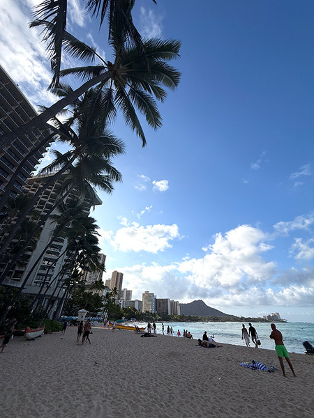 朝の8時頃のワイキキビーチです。私たちは、ちょうどアウトリガーの前あたりにいます・・・